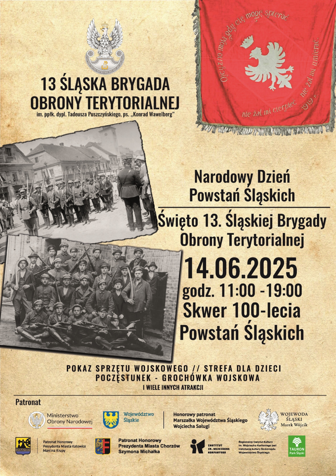 Już w najbliższą sobotę, 14 czerwca 2025 roku, zapraszamy do udziału w wyjątkowym wydarzeniu – Narodowym Dniu Powstań Śląskich połączonym ze Świętem 13. Śląskiej Brygady Obrony Terytorialnej. Obchody odbędą się w godzinach 11:00–19:00 na Skwerze 100-lecia Powstań Śląskich w TAURON Parku Śląskim.