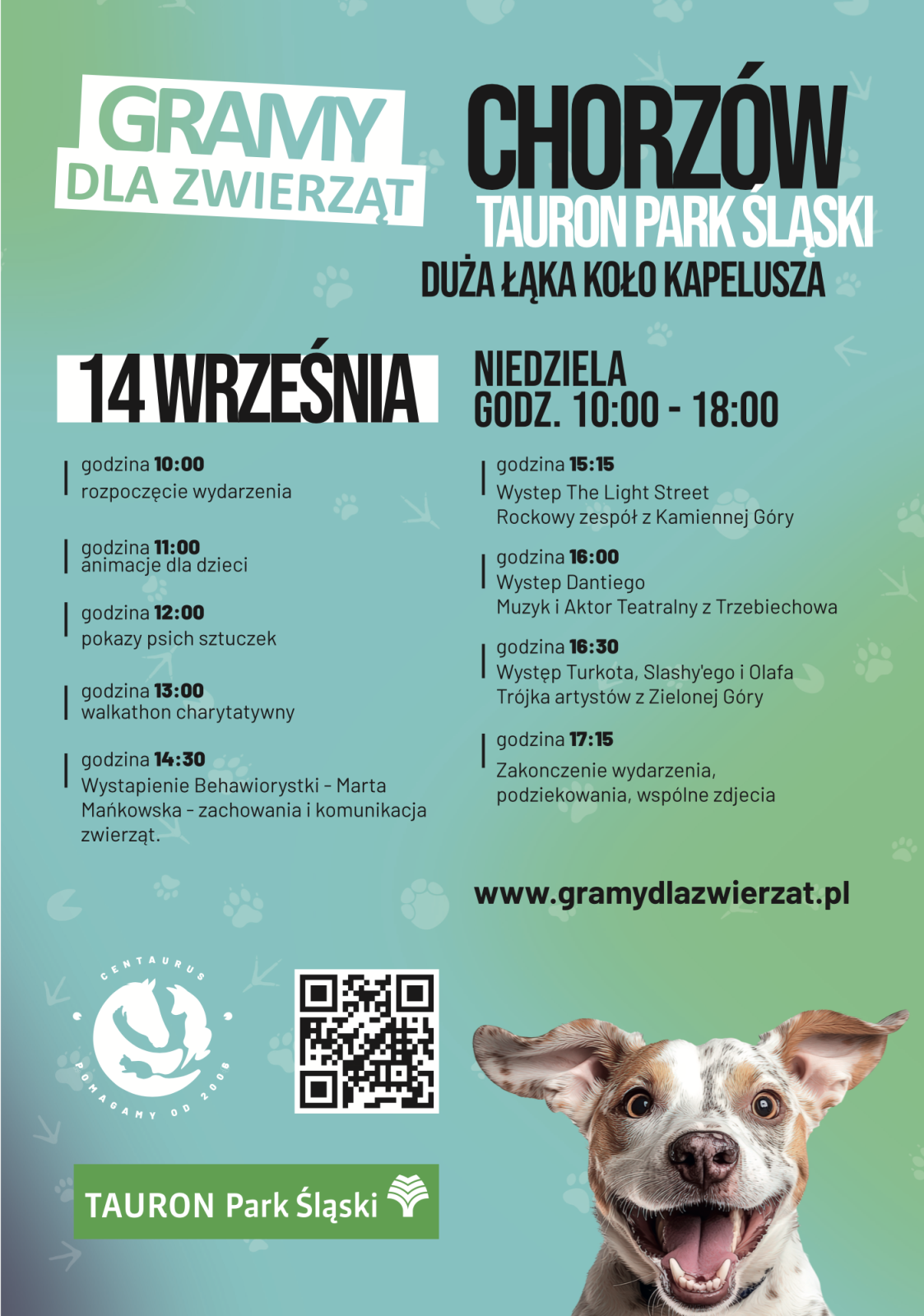 Już 14 września widzimy się w sercu TAURON Parku Śląskiego, na Dużej Łące, żeby wspólnie pomagać wszystkim zwierzętom! Czeka na Was dzień pełen muzyki, wiedzy i dobrej zabawy: koncerty, warsztaty, pokazy, strefy tematyczne i aktywności dla całych rodzin.