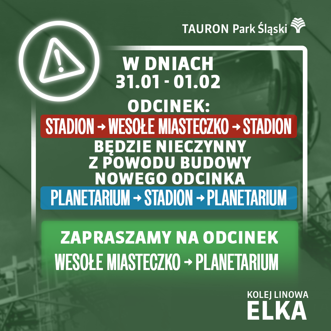 W związku z budową trzeciego odcinka Kolei Linowej Elka w dniach 31 stycznia i 1 lutego kolejka nie będzie kursować na trasie Stadion Śląski - Wesołe Miasteczko.