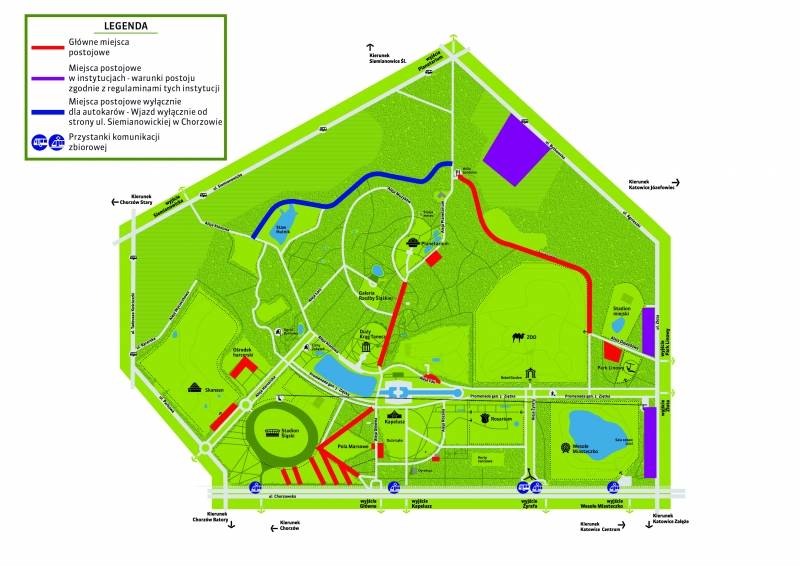 - Zapoznaj się z mapą miejsc postojowych w Parku Śląskim i weź pod uwagę, że ich ilość jest ograniczona.