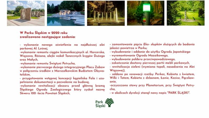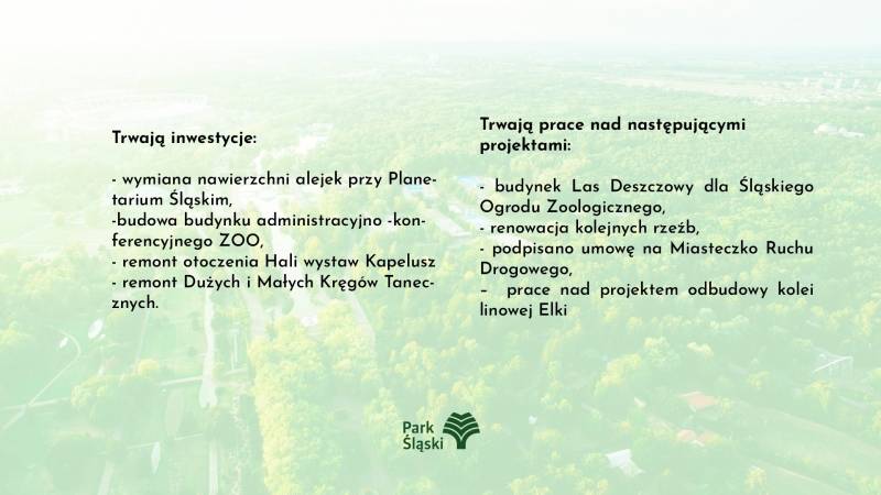 „W lutym 2020 r. zostałam powołana na stanowisko Prezesa Zarządu Wojewódzkiego Parku Kultury i Wypoczynku im. Gen Jerzego Ziętka. Było to dla mnie ogromne wyzwanie, mam nadzieje, że sprostałam oczekiwaniom zarówno Państwa jak i Zarządu Województwa Śląskiego. Przez ten czas, ciężki okres covidowy zrealizowaliśmy wiele dużych inwestycji. Oddaliśmy do użytku zmodernizowany Ogród Mozaikowy, Ogród Japoński, Świątynię Petrycha. Powstał wspaniały plac zabaw, na który zdecydowanie zasługują parkowi goście. Poprzez remont polderu przeciwpowodziowego poprawiliśmy gospodarkę wodną w Parku. Wiele ze ścieżek ujętych w projekcie zostało zrealizowanych, wiele jeszcze jest w trakcie realizacji. Również prace związane z budową Parku Wielu Pokoleń są w kluczowej fazie, w realizacji Psi Wybieg oraz Ogród Społeczności Parkowej. Już wkrótce podpisanie umów na budowę Miasteczka Ruchu Drogowego, Placu Wodnego, Lasu Deszczowego. Przez ten czas udało się również ożywić Park Śląski i udowodnić, że jest na każdą pogodę i porę roku. Kontynuowaliśmy tradycyjne wydarzenia tj. śniadanie na trawie, czy muzyczny bukiet róż, bieg wiosenny. Zrealizowaliśmy nowe wspaniałe wydarzenia cykliczne jak Parkowy Wrzesień z Kulturą, który połączył jednostki kultury województwa śląskiego na parkowej scenie. Powróciły kultowe wystawy kwiatów. Z okazji jubileuszu Parku wydaliśmy album „Kronika Parkowa. 70 ciekawostek na 70 lecie Parku Śląskiego”, który został doceniony przez szerokie grono odbiorców i trzykrotnie nagrodzony. Kolej Linowa Elka również poprawiła swoje wyniki przychodowe, tegoroczna frekwencja pokazała, ze nadal jest to uwielbiana przez wiele osób atrakcja. Ważnym aspektem jest również wynik finansowy Spółki, który został znacząco poprawiony, a ten rok powinien być jeszcze lepszy. Patrząc na ograniczenia spowodowane wystąpieniem Covid-19, które mocno odczuliśmy wszyscy, uważam, że przyjęliśmy bardzo dobry kierunek działania. Pomimo wielu już wdrożonych zmian, Park Śląski potrzebuje środków finansowych, które są niezbędne do kontynuacji rozpoczętych przemian. Biorąc pod uwagę powyższe i ogromny wkład pracy, energii i serca jakie włożyłam w pracę na rzecz Parku Śląskiego decyzja, którą podjęłam nie była łatwa. Wierzę jednak, ze to co udało mi się zrobić i rozpocząć będzie służyło przez długie lata parkowym gościom. Park Śląski to niezwykła ponad 70 letnia historia, która pokazuje, że to ludzie tworzą to miejsce. Z tym przeświadczeniem wierzę, że Park powróci do swoich lat świetności. - Agnieszka Bożek”