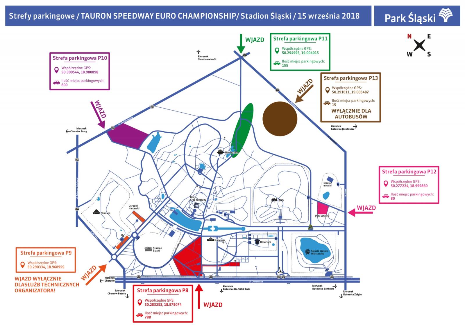 Po wykupieniu biletu należy kierować się do właściwych wjazdów do Stref Parkingowych, zgodnie z mapą załączoną do biletu i zamieszczonymi na mapie współrzędnymi GPS poszczególnych wjazdów. Nie ma możliwości przemieszczania się między strefami wewnątrz terenu Parku Śląskiego