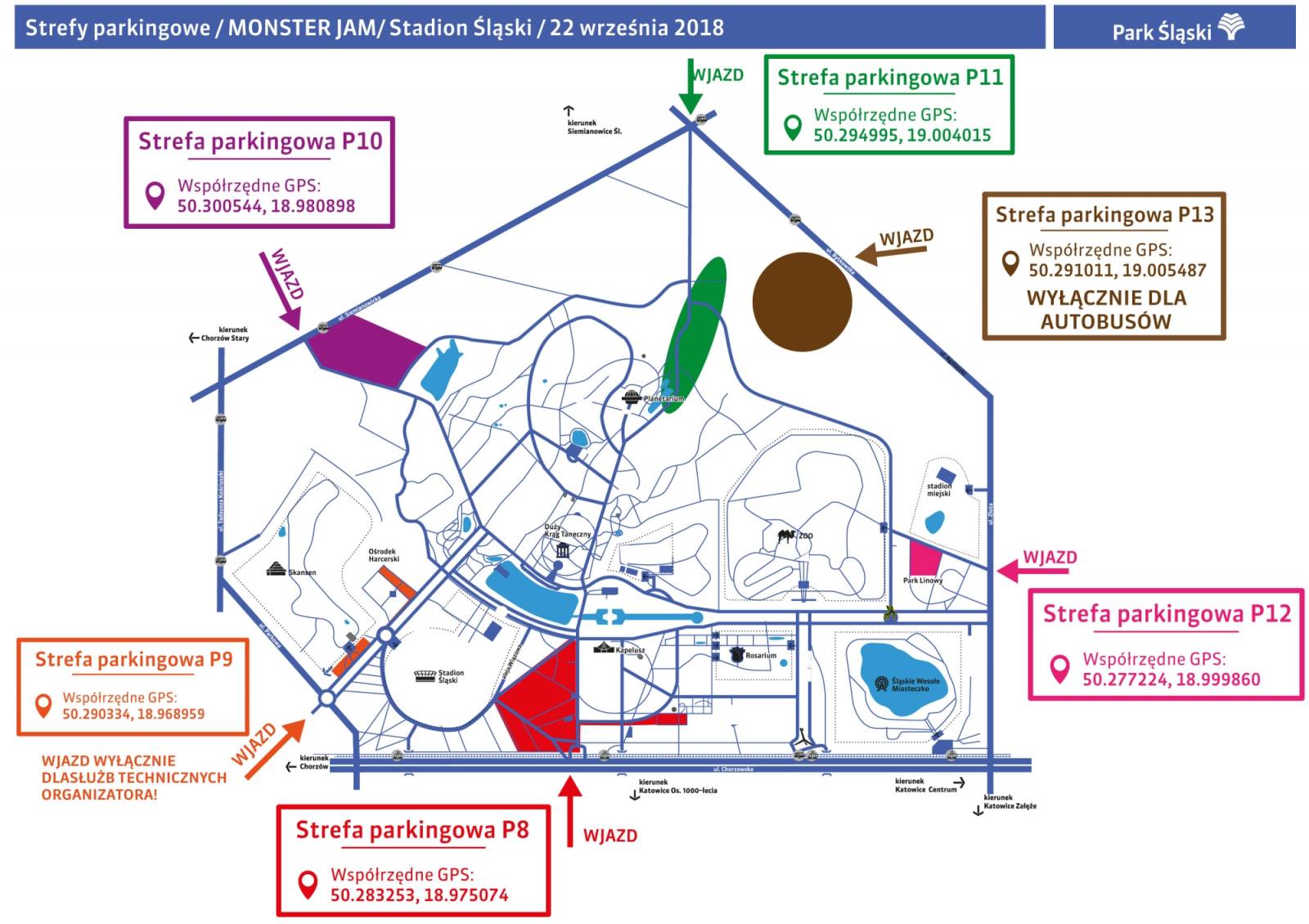 Ze względu na brak konkretnych numerów ulicy przy wjazdach do Parku Śląskiego zamieściliśmy Współrzędne GPS poszczególnych wjazdów (Współrzędne GPS są niezwykle ważne aby uniknąć zamieszania przy dojazdach do stref).