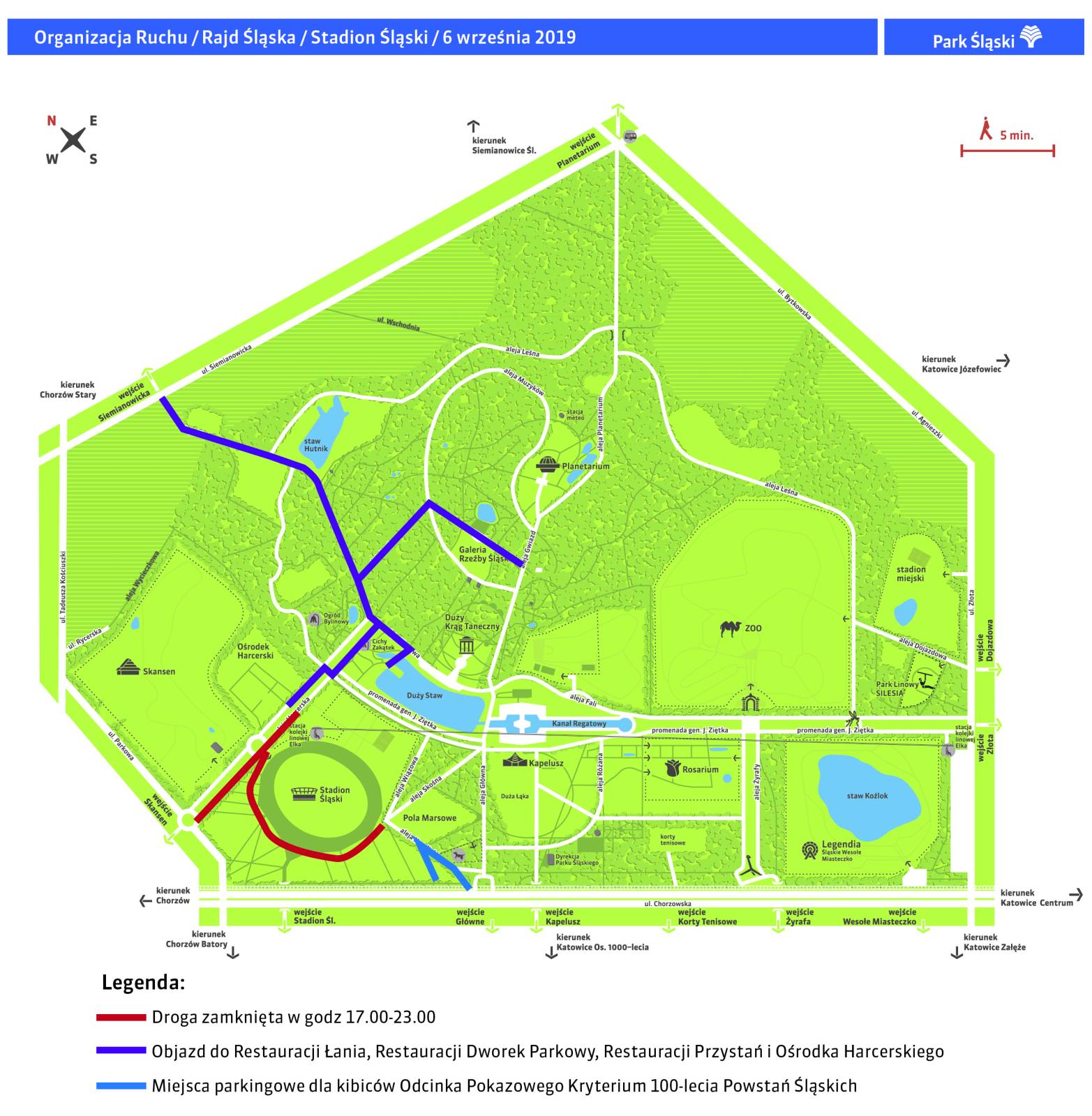 6 września na terenie Parku Śląskiego i na Stadionie Śląskim odbędzie się odcinek pokazowy Rajdu Śląska "Kryteria 100-lecia Powstań Śląskich". W związku z tym nastąpi zmiana organizacji ruchu, zgodnie z mapą załączoną poniżej. Utrudnień można się spodziewać w godzinach od 17 do 23. Dla kibiców zostały przygotowane miejsca parkingowe, które również zostały oznaczone na mapie.
